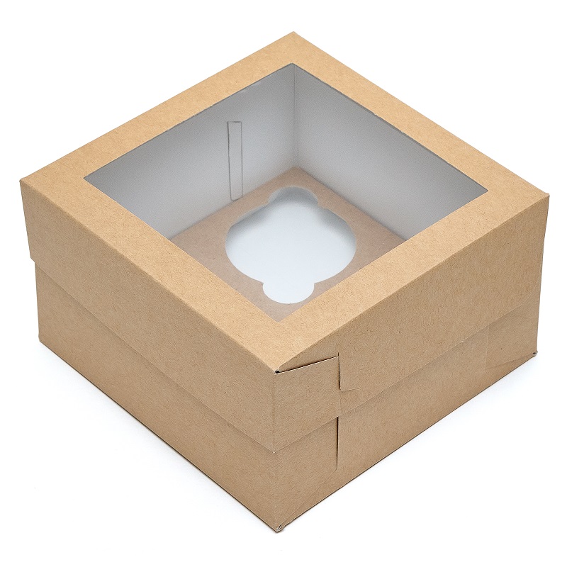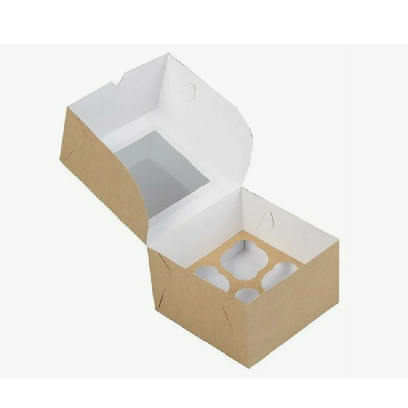 Коробка бумажная ЭкоЛайн 4 капкейка, 170х170х100 мм., окно, вкладыш, Крафт, Упаковка 200 штук