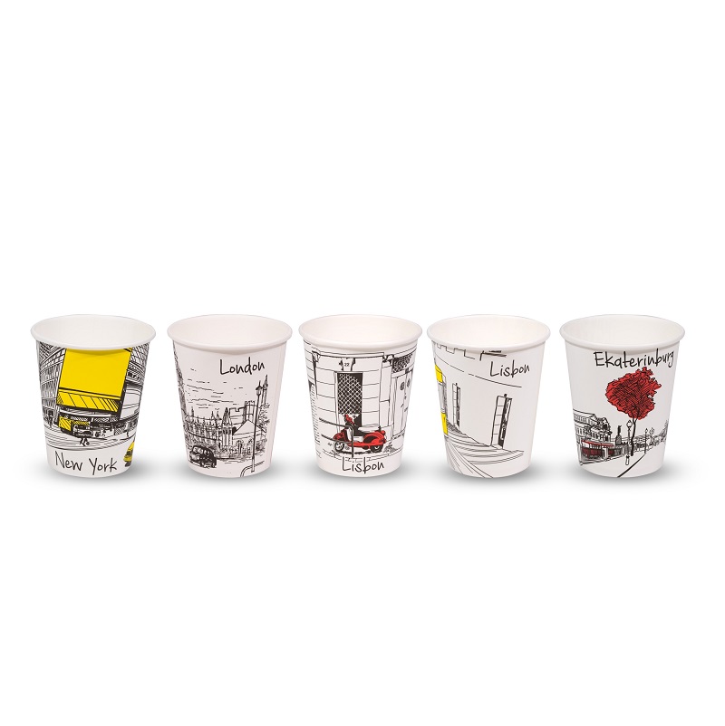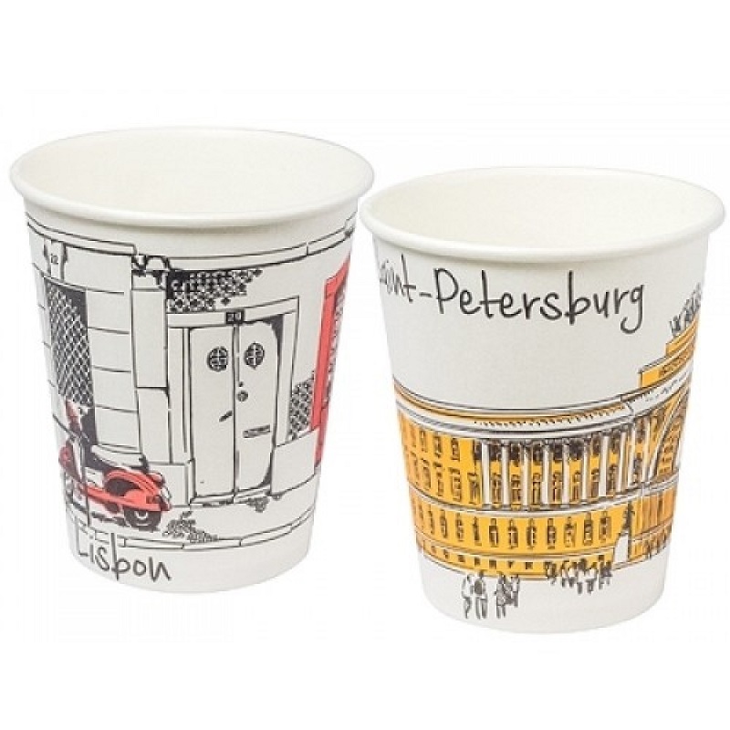 Стакан бумажный 250 мл, D 80мм, однослойные, холодное/горячее, Города, КОМПЛЕКТ 100 шт.